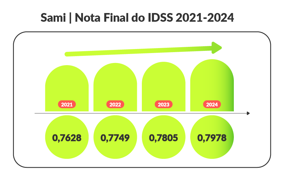 Pelo quarto ano consecutivo, nossa nota geral no IDSS cresceu, alcançando 0,7978 na avaliação de 2024. Esse crescimento consistente demonstra a solidez e a evolução contínua do nosso modelo, que nasceu para ser diferente.
